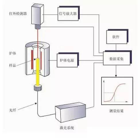 高強(qiáng)度的能量脈沖對(duì)小而薄的試樣進(jìn)行短時(shí)間的輻照,脈沖的能量被樣品的下表面吸收并記錄其所導(dǎo)致上表面溫度上升(溫度變化曲線)。熱擴(kuò)散系數(shù)的值通過(guò)試樣的厚度和上表面溫度上升達(dá)到某一比值的最大值所需要的時(shí)間計(jì)算出來(lái)。