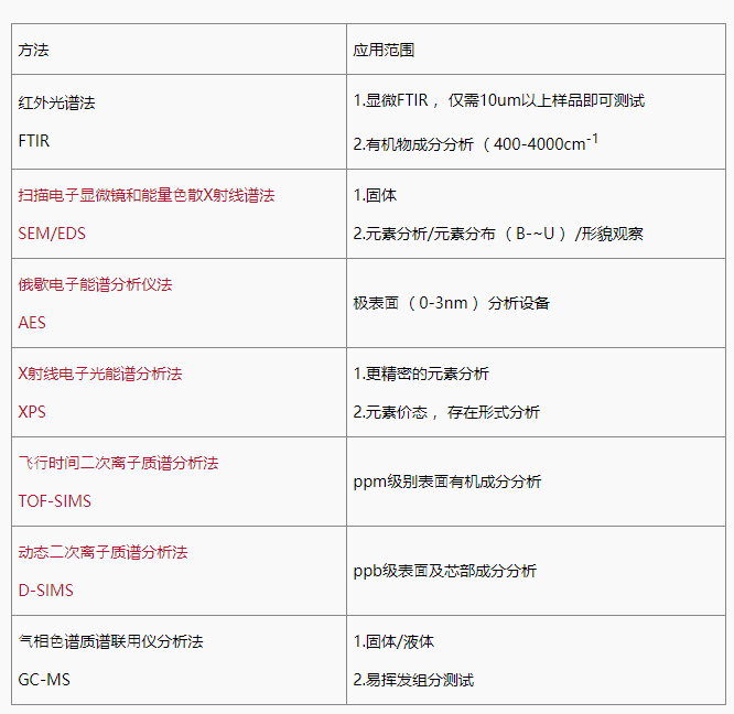 針對產(chǎn)品表面的有機異物,根據(jù)異物的形態(tài)、檢測深度及檢測面積等差異而選用特定的儀器,對其有機成分進行分析,判定其主成分,從而獲取異物信息的一種分析方法。